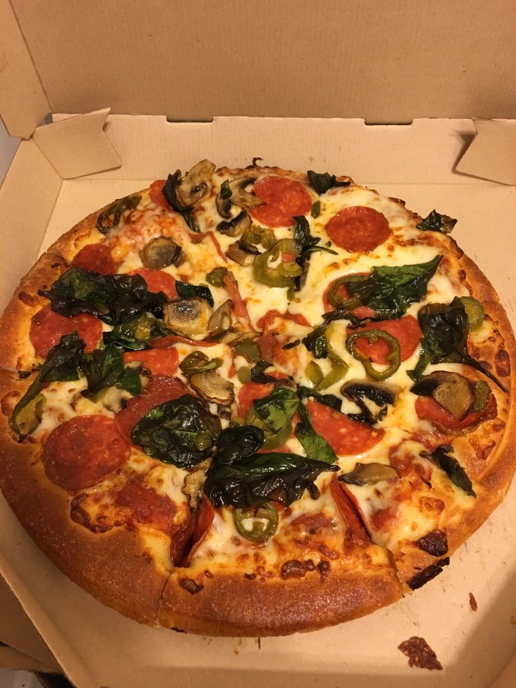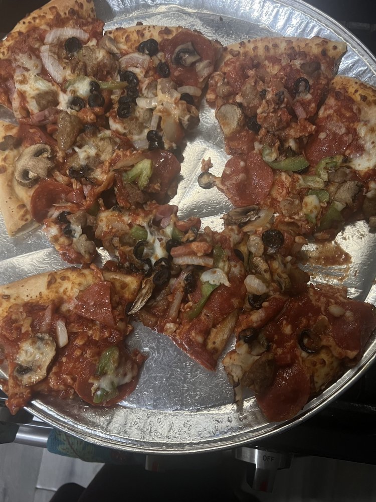 This loaded pizza is the perfect choice for family dinner or a lunch with your crew. Includes pepperoni, seasoned pork, beef, mushrooms, green bell peppers and onions.